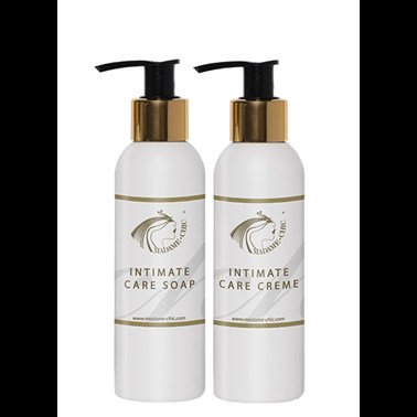 Som alla Madame Chic’s produkter är Intimate Care-produkterna mycket dryga, så var varsam med doseringen. Skölj med vatten och tvätta försiktigt hela underlivet med Intimate Care Soap, skölj sedan av med vatten. Överdriv aldrig tvättningen av ditt underliv. Smörj hela underlivet, inklusive inre och yttre blygdläppar varje dag med Intimate Care Creme.